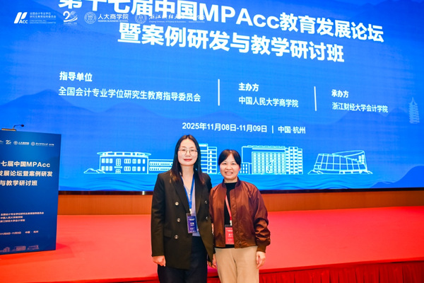 11月8日至9日,由全国会计专业学位研究生教育指导委员会指导,中国人大商学院主办,浙江财经大学会计学院承办的第十七届中国MPAcc教育发展论坛暨案例研发与教学研讨班在浙江嘉兴成功举办。本次论坛以“数智赋能·案例育人”为核心,聚焦会计与审计领域的热点议题,通过开幕式、主题演讲、圆桌讨论、分论坛报告等多元形式,汇聚学界专家、实务精英与青年学者,共同探讨财务会计、数据治理、审计监督及可持续治理的前沿实践与教学创新。来自全国高校200余名代表参会,管理学院教师郭雪飞全程参加了会议。