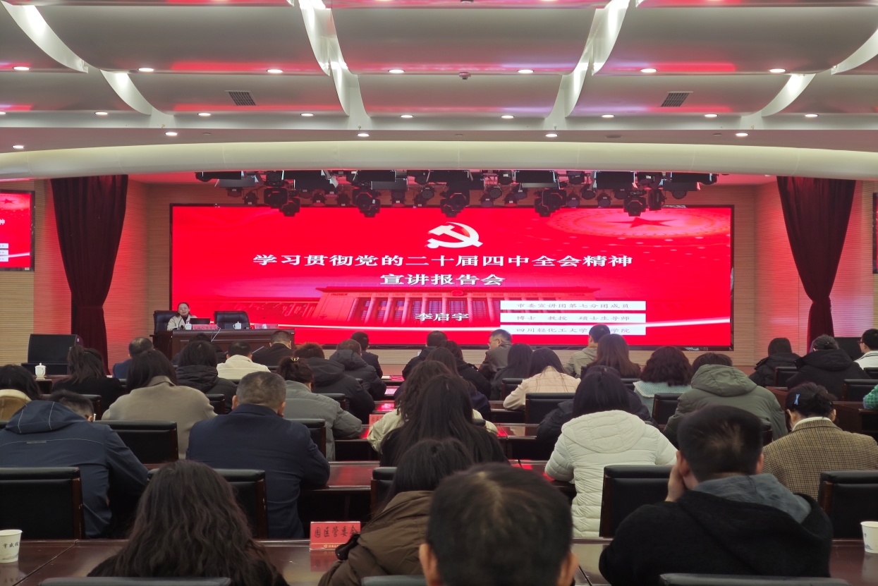 2025年12月12日下午,自贡市委宣讲团第七分团成员、管理学院李启宇教授到自贡沿滩高新技术产业园区宣讲党的二十届四中全会精神。宣讲会由自贡沿滩高新技术产业园区管委会副主任梁宇主持。沿滩高新技术产业园区管委会、沿滩区科技和经济信息化局、沿滩区统计局、沿滩区投资促进局干部、企业代表100余人参加了宣讲会。