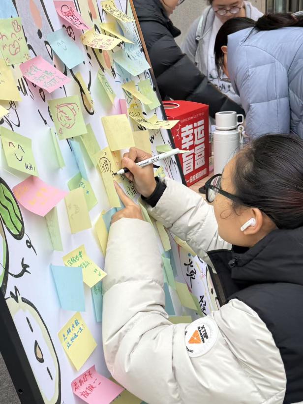线下活动于12月17日同步开展。李白河校区A区食堂门前,“情绪交换盲盒”吸引同学们敞开心扉写下烦恼,并随机抽取他人留下的温暖寄语,形成“倾诉-收获-回应”的善意循环;“共绘笑脸墙”上,同学们创作各具特色的笑脸图案,并留下“接纳自己,向阳而生”“愿我们都被温柔以待”等真挚话语,共同构筑成校园里一道温暖风景。同日,宜宾校区A3-401教室举办“心灵绿洲”心理电影赏析活动,经典影片《雨人》引发深切共鸣。观影后的分享环节中,同学们结合自身经历,畅谈对亲情、自我接纳与情绪管理的理解,进一步深化了对心理健康的认识。