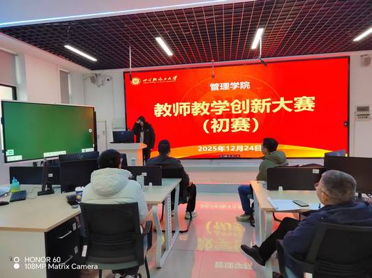 12月24日,管理学院2025年教师教学创新大赛学院选拔赛在宜宾校区A2-431教室举行。比赛吸引了来自学院五个教学系的7名教师(团队)参加。学院成立了由院领导、教授及系主任组成的评审委员会。