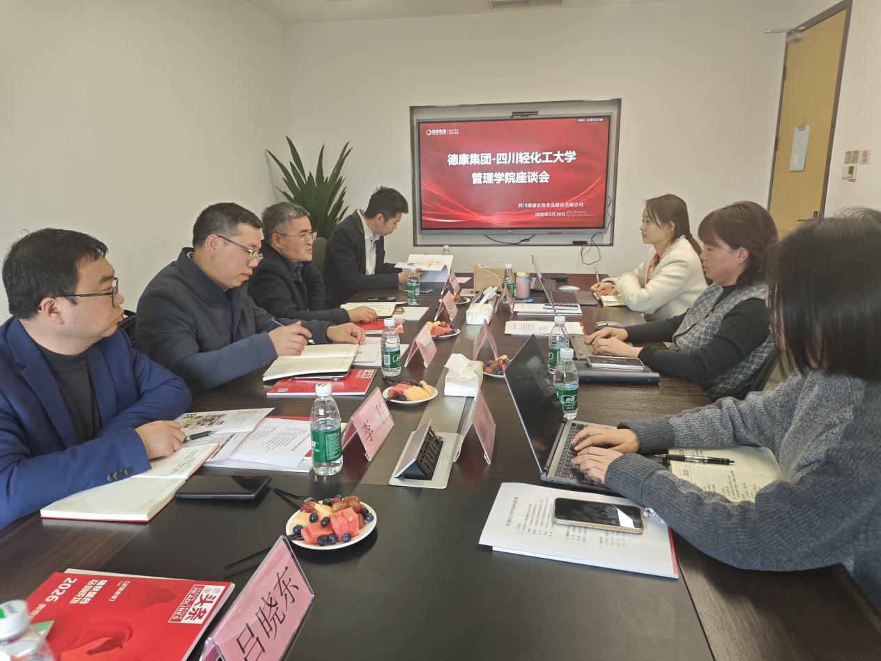 下午,调研组赴德康集团总部与事业部综合部部长刘蕤等企业代表座谈。刘蕤从企业规模、技术优势、人才战略等方面系统介绍了德康集团的发展情况,并表达了对高素质管理人才的迫切需求。韦崇岗和陈希勇分别介绍了学院学科特色、人才培养成果及社会服务能力,强调希望通过校企合作实现资源共享、优势互补。双方重点探讨了共建实习实训基地、开设“德康订单班”、联合开展横向课题研究等合作路径,并就定期互访、人才共育机制达成共识。