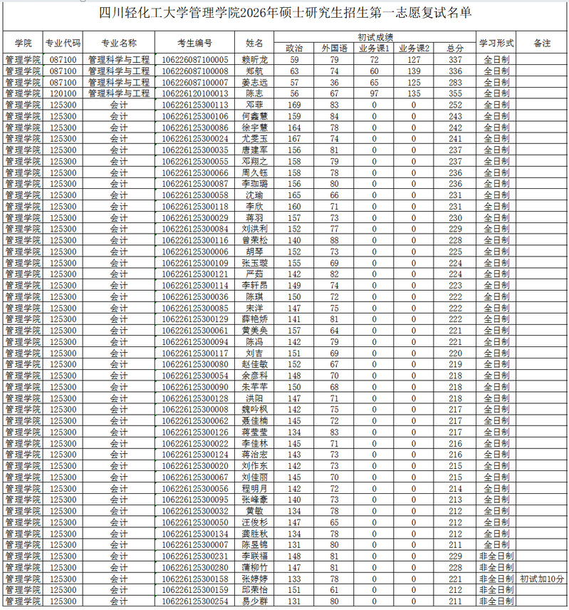 四川轻化工大学管理学院2026年硕士研究生招生第一志愿复试名单