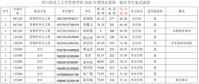 根据教育部、四川省及《四川轻化工大学2026年硕士研究生招生复试录取办法》等相关文件精神,本学院坚持综合评价、择优录取,确保公平、公正、科学,严格、规范地组织了2026年硕士研究生复试录取工作。调剂志愿第一批次考生已复试完毕,经复核无误后,现将复试成绩予以公布(详见附表)。